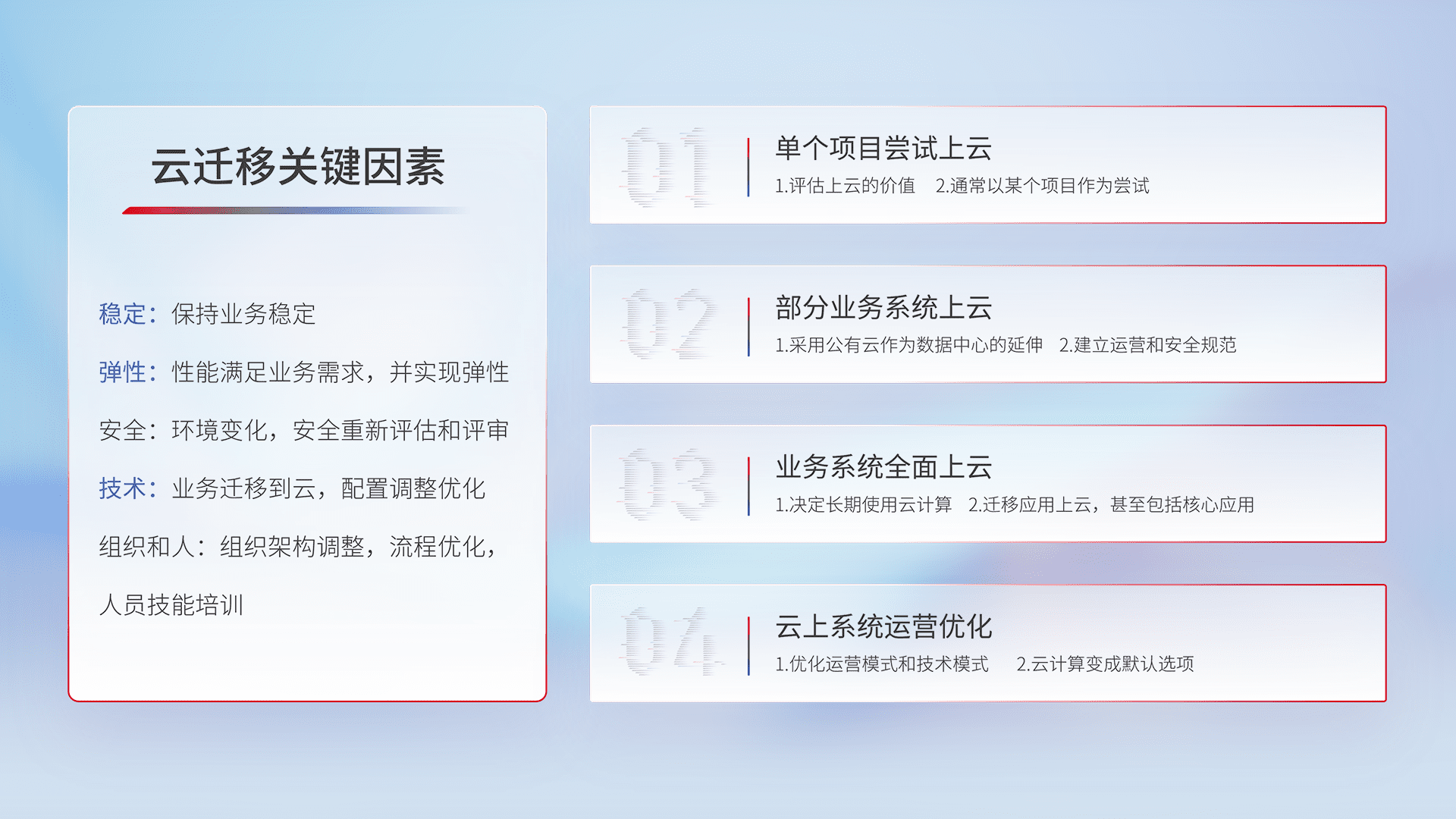结合实际业务,,,从规划设计、、、、云平台选型、、云原生改造、、、、数据迁移、、、、集成交付,,,,迁移全过程为客户识别最佳上云路径,,,做好风险识别管理,,设计网络架构、、、、身份权限、、、安全审计合规、、操作审计、、日志审计、、、、监控告警策略、、、多站点容灾设计等,,,对云上基础设施进行整体规划,,提升IT治理水平,,,,以满足弹性、、高可用、、、高性能的需求。。。。