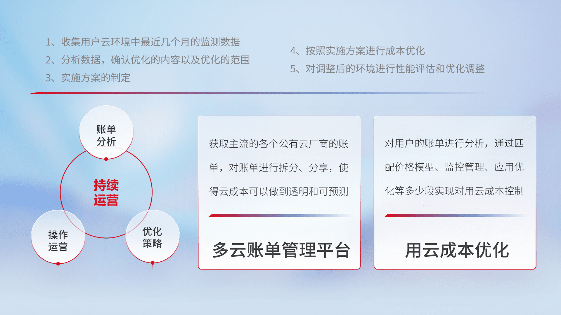 通过多云纳管,,,以统一的资源数据模型把客户的云资源进行抽象和封装,,进而实现对多云资源的统一操作,,,,保障云资源管理的可靠性、、稳定性与可用性。。。。量身定制化运维内容,,,配置、、、、开发运维、、、、补丁管理、、备份、、监控、、、认证和访问管理、、审计和日常巡检等,,保障在用云过程中的可靠度,,,稳定度以及高可用率。。。