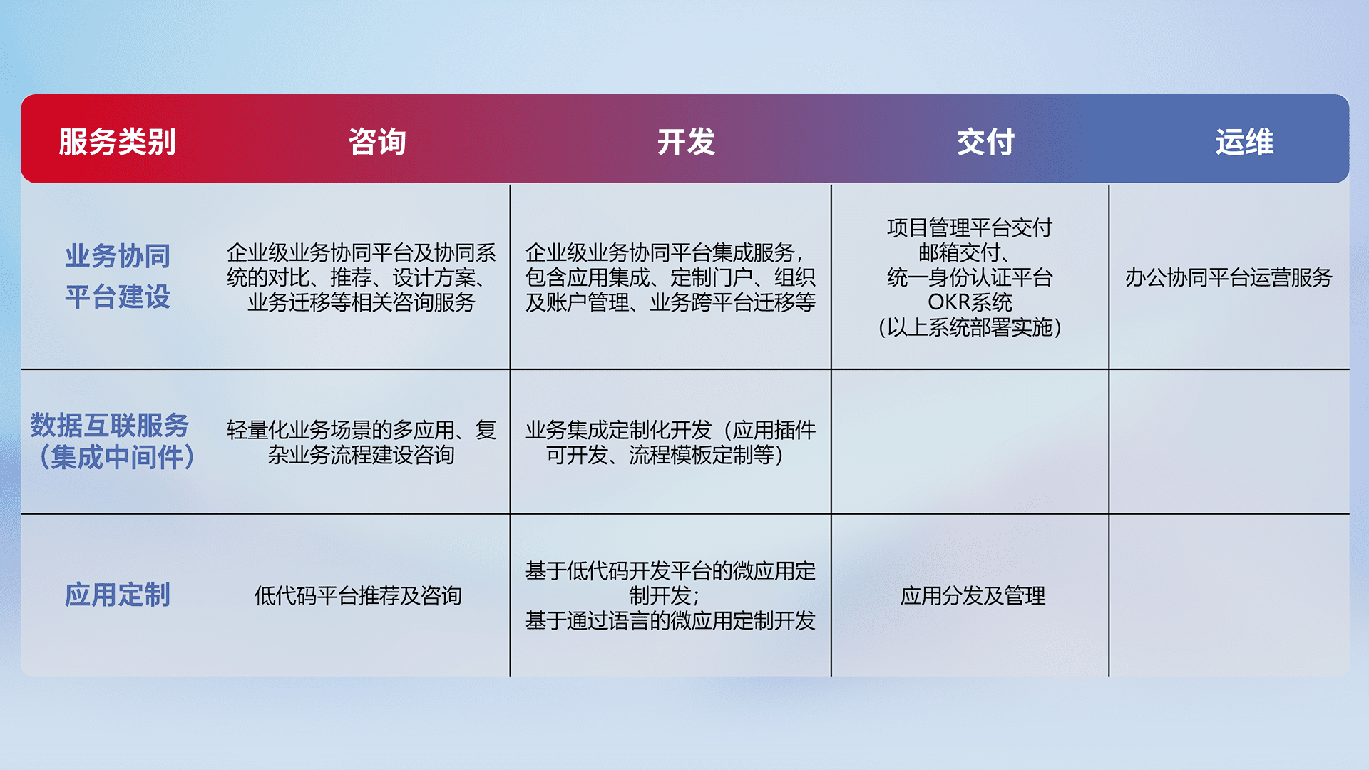 针对钉钉、、企微、、、、IDaas等平台级产品提供产品的规划、、、方案、、、交付、、、、定制化开发等服务,,,实现如统一协同办公、、、智能客户服务、、、混合会议管理、、、、智能数据查询、、、等业务场景,,,,实现数字化转型。。。